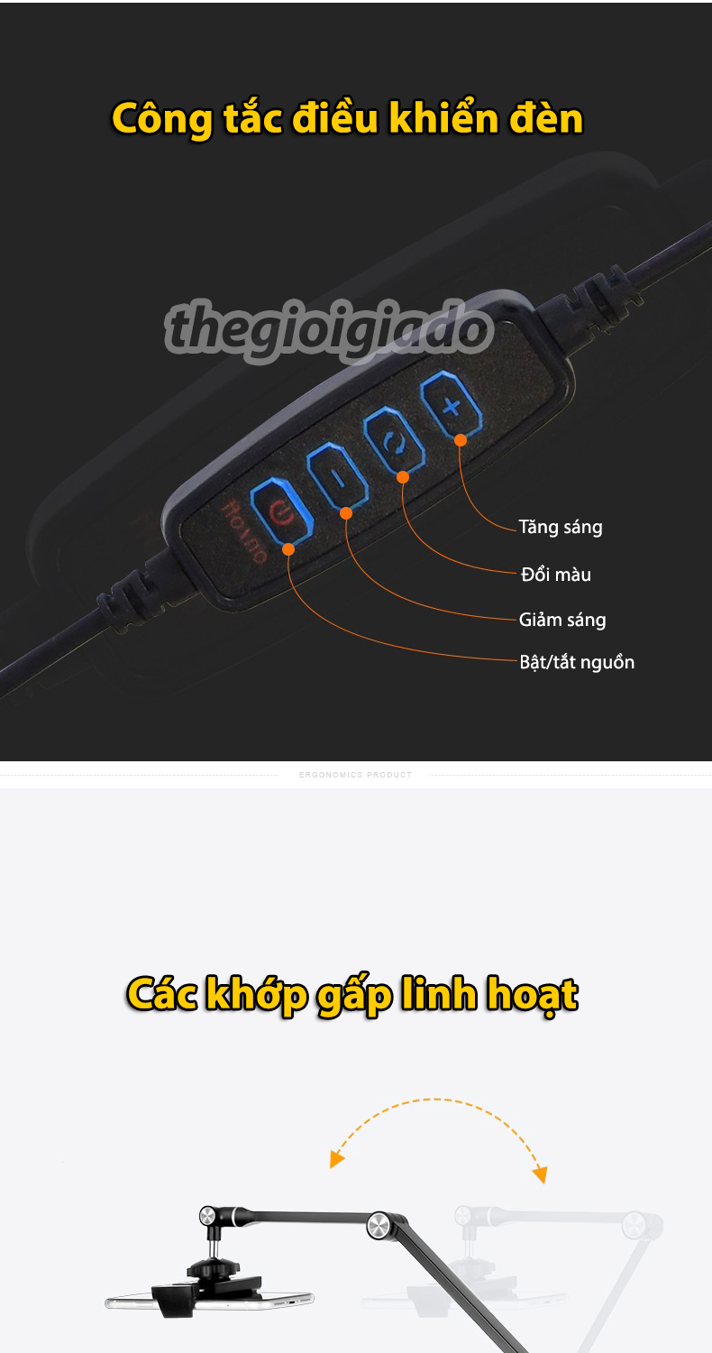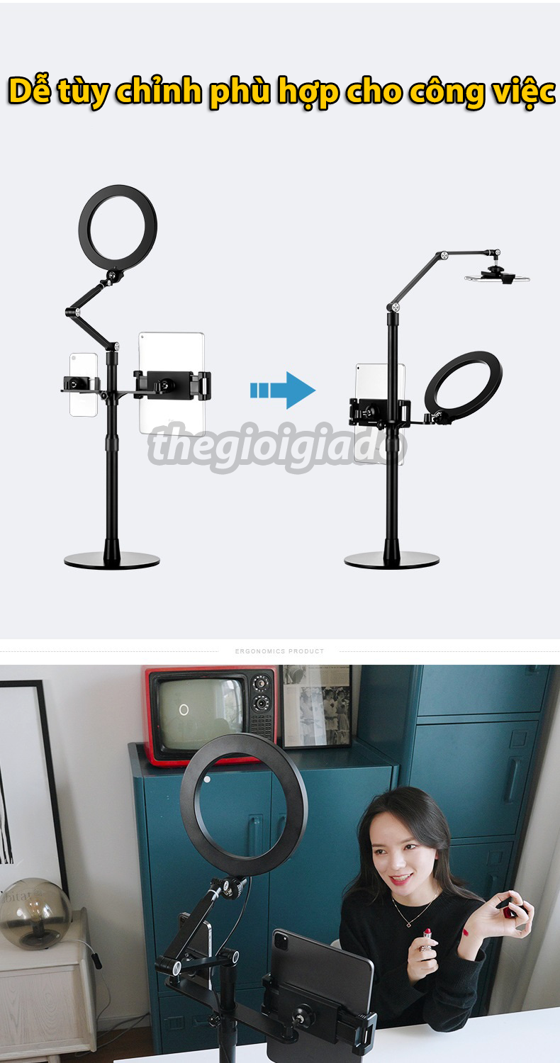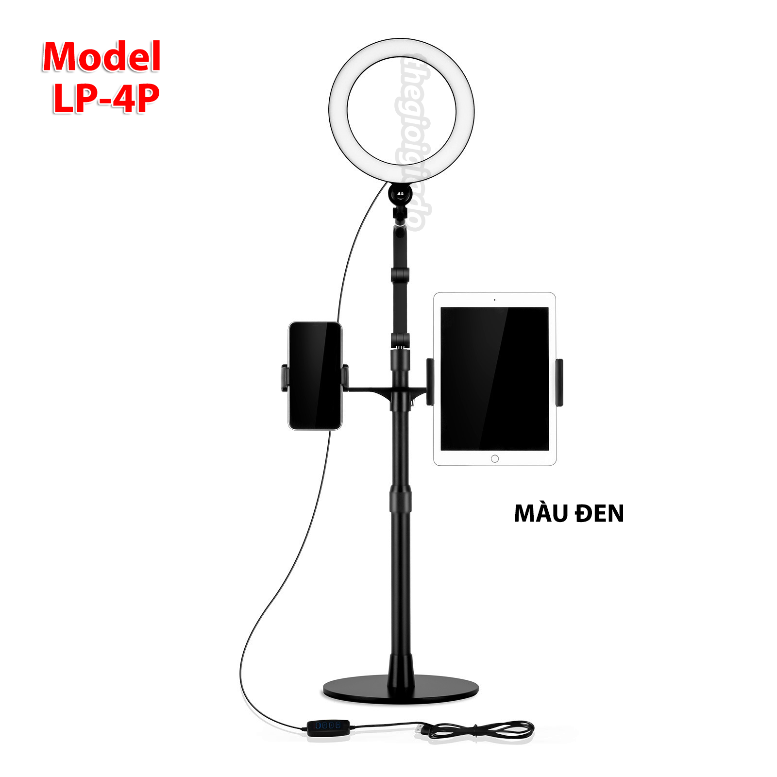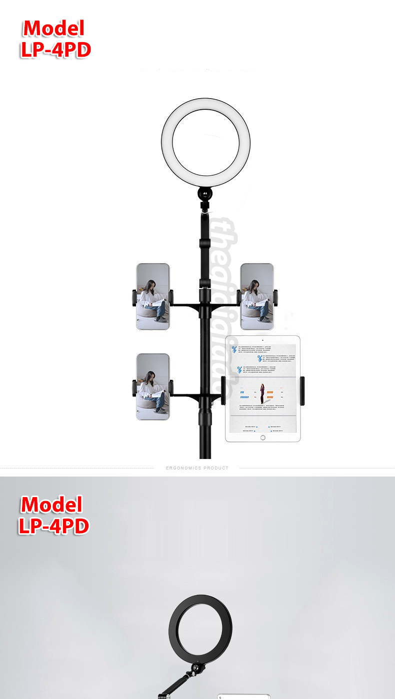 Model LP-4P/LP-4PD là giá đỡ đa năng tích hợp đèn livestream chuyên nghiệp, cho phép kẹp đồng thời điện thoại và máy tính bảng. Thiết kế chắc chắn, ánh sáng đều màu, khả năng điều chỉnh linh hoạt giúp bạn có được khung hình chuẩn studio ngay tại nhà.