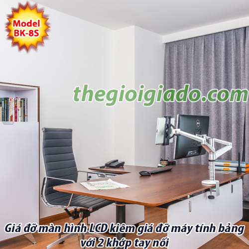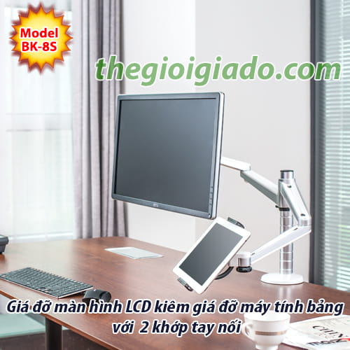 - Model BK-8S là model cho phép đỡ đồng thời màn hình LCD (cánh tay có 2 khuỷu) và MÁY TÍNH BẢNG (cánh tay có 2 khuỷu).
